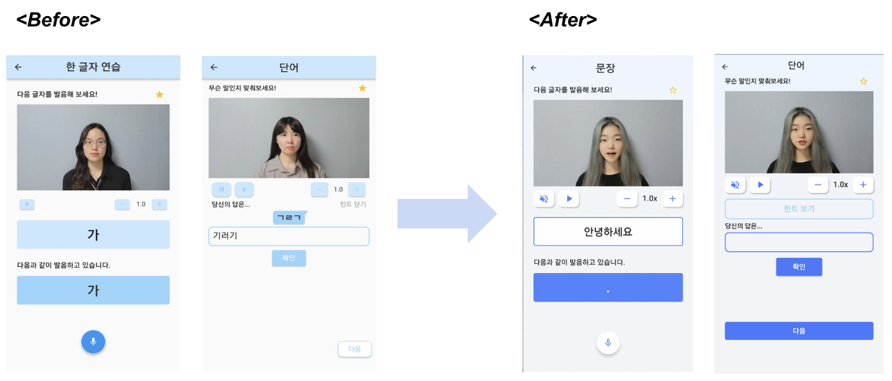 2. 사용자의 앱 사용성의 측면에서 구화 학습 탭과 말하기 학습 탭을 합쳐 연습 페이지에 들어가기 까지 필요한 탭의 횟수를 줄이는 것이 좋을지 혹은 다른 방식을 사용하는 것이 좋을지